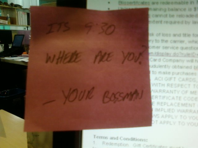 Came in late this morning to find this stickied to my computer. That BM is learning.